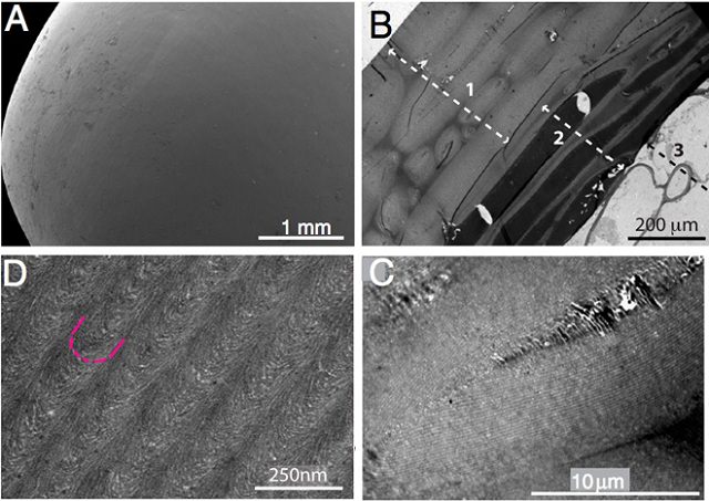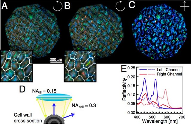 Cross-section of a berry produces circular polarized light that spirals to the left (figure A) and to the right (figure B). (In figure C, they”re combined.) Why a berry should produce any circular polarized light at all, however, is an open question.